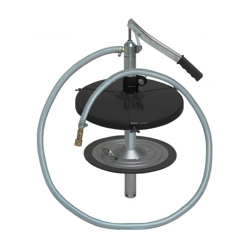 Pompa do napełniania układów centralnego smarowania z pokrywą pociadającą 3 śruby motylkowe do zaciśnięcia na beczce, membraną popychającą smar oraz 2-metrowym wężem PVC.